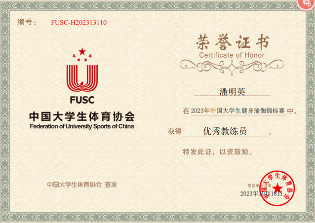作为校健身瑜伽队金牌教练,潘明英老师带领健身瑜伽团队多次荣获全国第一名的优异成绩并多次荣获“优秀教练员”与“优秀裁判员”称号。2014年我校瑜伽队在全国大学生体育竞赛活动中取得第一名的好成绩,实现了我校大学生体育竞赛全国第一名零的突破。至今,我校校健身瑜伽运动队多次在省、市乃至全国各大比赛中取得优异成绩,如2014年7月荣获“全国高校首届大众瑜伽比赛”团体第一名;2016年8月荣获“全国健身瑜伽公开赛”团体第一名;2017至2019年荣获CSARA第13届、14届、15届“中国大学生健康活力大赛”一等奖;2022年12月荣获“中国大学生健身瑜伽”比赛团体第一名;2023年6月荣获“常州市运会健身瑜伽”比赛团体第一名;2023年10月荣获“中国大学生健身瑜伽锦标赛”二级集体第一名。
