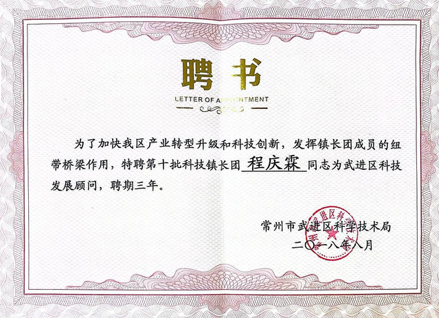 2016年,工作不久的程庆霖老师就经学校党委组织部的选派,赴武进区雪堰镇挂职党委副书记,协管科技、人才和环境保护工作。“两年行车5万公里,雪堰镇的各个角落,都可以找到程书记留下的脚印”。这是武进区委组织部“武进英才”公众号对程庆霖老师挂职成果的总结。两年来,程庆霖老师不仅为雪堰镇政府和企业引进各类层次人才,还充分利用高校资源,为企业引进教授、博士解决各类技术难题。除此之外,防洪抗涝、抗击暴雪、精准扶贫、服务三农,在雪堰镇的各个田间地头都可以看到程庆霖老师的身影。挂职期间,连续两年被挂职考核优秀,并于挂职结束后,受聘武进区科技发展顾问。